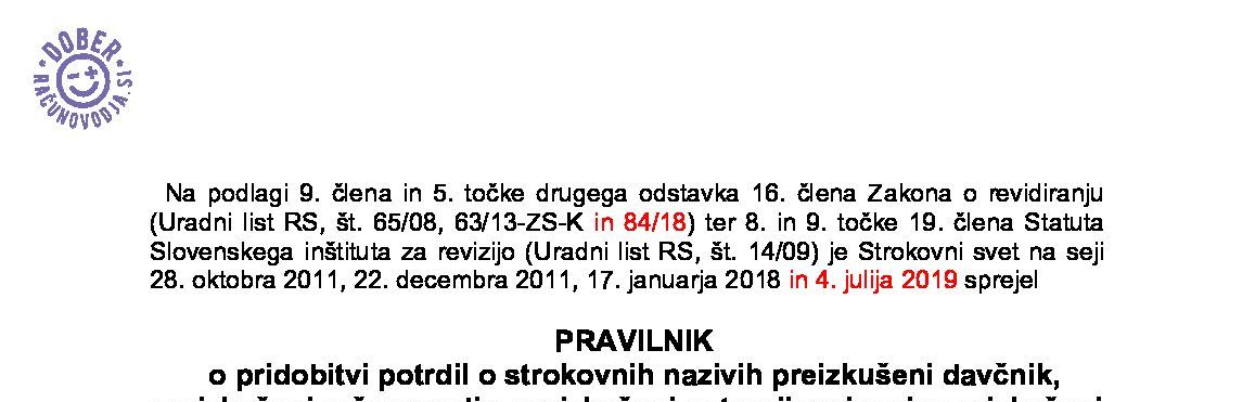 Pravilnik o pogojih za pridobitev potrdila o strokovnih znanjih za opravljanje nalog pooblaščenega revizorja, potrdila o strokovnih znanjih za opravljanje nalog dajanja zagotovil o trajnostnosti in obveznem praktičnem usposabljanju 22.02.2025 [!] 25.02.2025