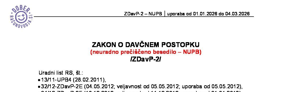 | ZAKON O DAVČNEM POSTOPKU (ZDavP-2 - neuradno prečiščeno besedilo) | 05.03.2026 | [!] | 03.10.2025 | |