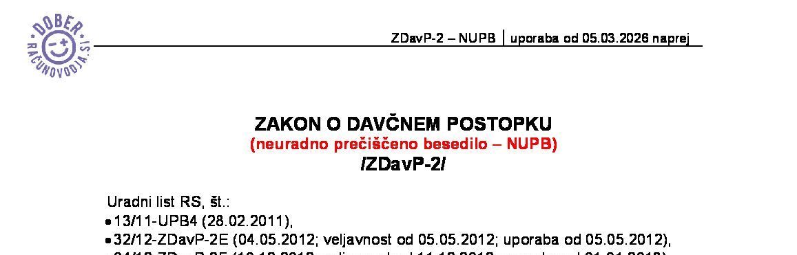 | ZAKON O DAVČNEM POSTOPKU (ZDavP-2 - neuradno prečiščeno besedilo) | 01.01.2026 | [!] | 04.03.2026 | 05.12.2025 |