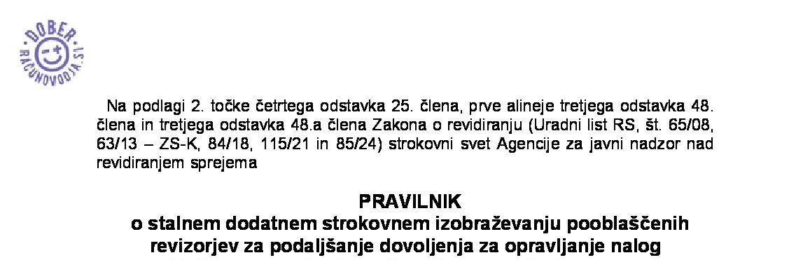 Pravilnik o pogojih za pridobitev potrdila o strokovnih znanjih za opravljanje nalog pooblaščenega revizorja, potrdila o strokovnih znanjih za opravljanje nalog dajanja zagotovil o trajnostnosti in obveznem praktičnem usposabljanju 22.02.2025 [!] 25.02.2025