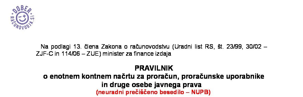 | Pravilnik o enotnem kontnem načrtu za proračun, proračunske uporabnike in druge osebe javnega prava (NUPB - neuradno prečiščeno besedilo) | 04.03.2026 | 06.03.2026 | ||