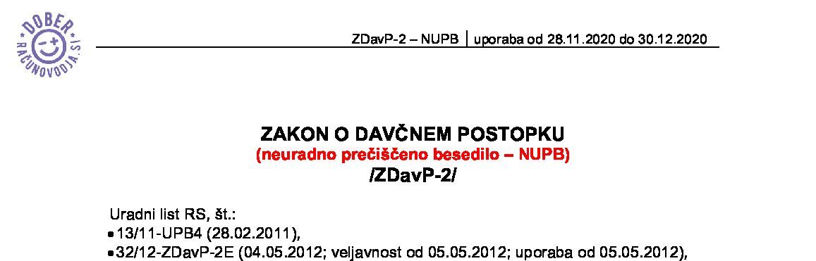 | ZAKON O DAVČNEM POSTOPKU (ZDavP-2 - neuradno prečiščeno besedilo) | 11.12.2024 | [!] | 28.11.2024 | |