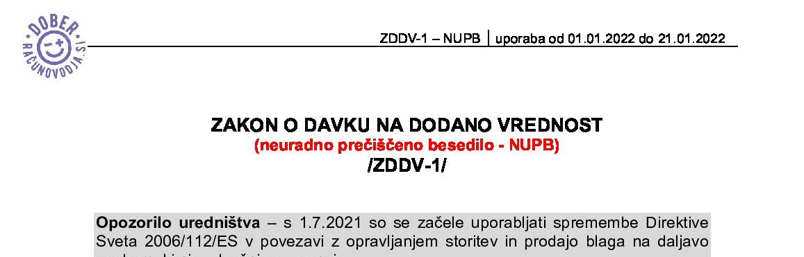 ZAKON O DAVKU NA DODANO VREDNOST (ZDDV-1 - neuradno prečiščeno besedilo) 06.12.2023 [!] 31.12.2023 05.12.2023