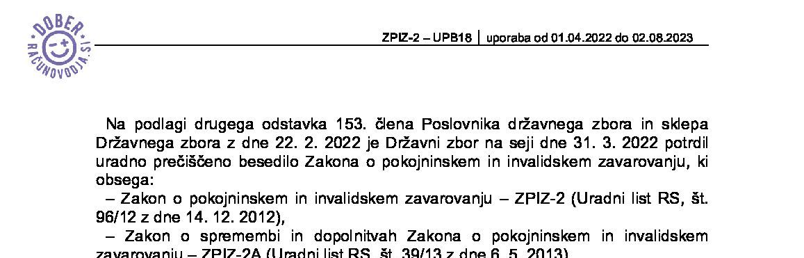 | ZAKON O POKOJNINSKEM IN INVALIDSKEM ZAVAROVANJU (ZPIZ-2 - neuradno prečiščeno besedilo) | 01.04.2022 | [!] | 02.08.2023 | 09.03.2022 |