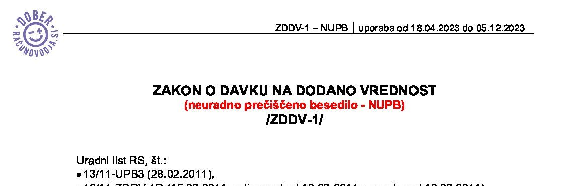 | ZAKON O DAVKU NA DODANO VREDNOST (ZDDV-1 - neuradno prečiščeno besedilo) | 06.12.2023 | [!] | 31.12.2023 | 05.12.2023 |