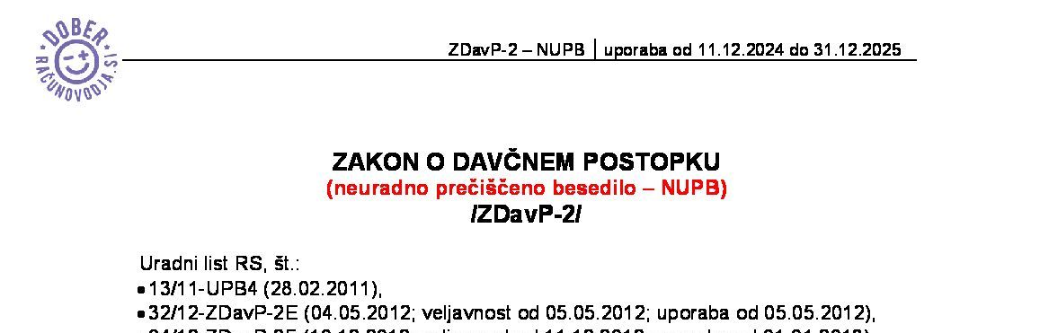 | ZAKON O DAVČNEM POSTOPKU (ZDavP-2 - neuradno prečiščeno besedilo) | 01.01.2024 | [!] | 10.12.2024 | 04.01.2024 |