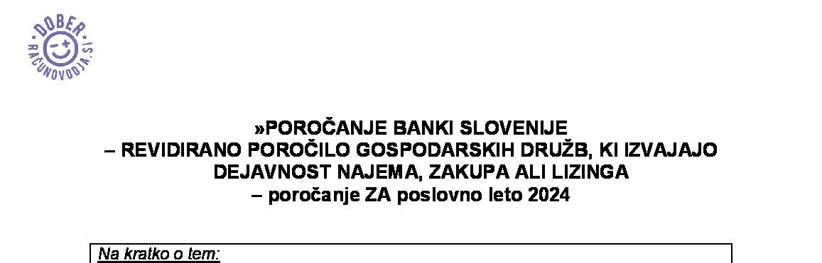 POROČANJE BANKI SLOVENIJE - POROČILO GOSPODARSKIH DRUŽB, KI IZVAJAJO DEJAVNOST NAJEMA, ZAKUPA ALI LIZINGA - poročanje v letu 2025 09.12.2024