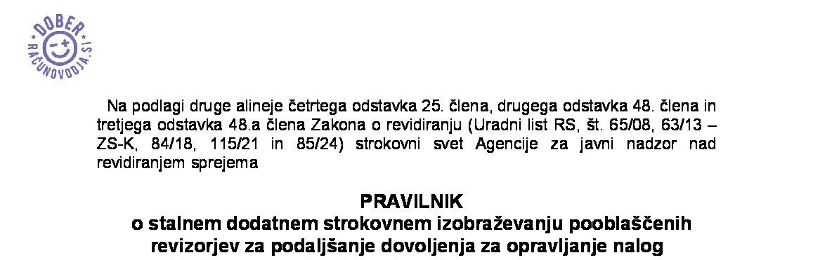 Pravilnik o pogojih za pridobitev potrdila o strokovnih znanjih za opravljanje nalog pooblaščenega revizorja, potrdila o strokovnih znanjih za opravljanje nalog dajanja zagotovil o trajnostnosti in obveznem praktičnem usposabljanju 22.02.2025 [!] 25.02.2025
